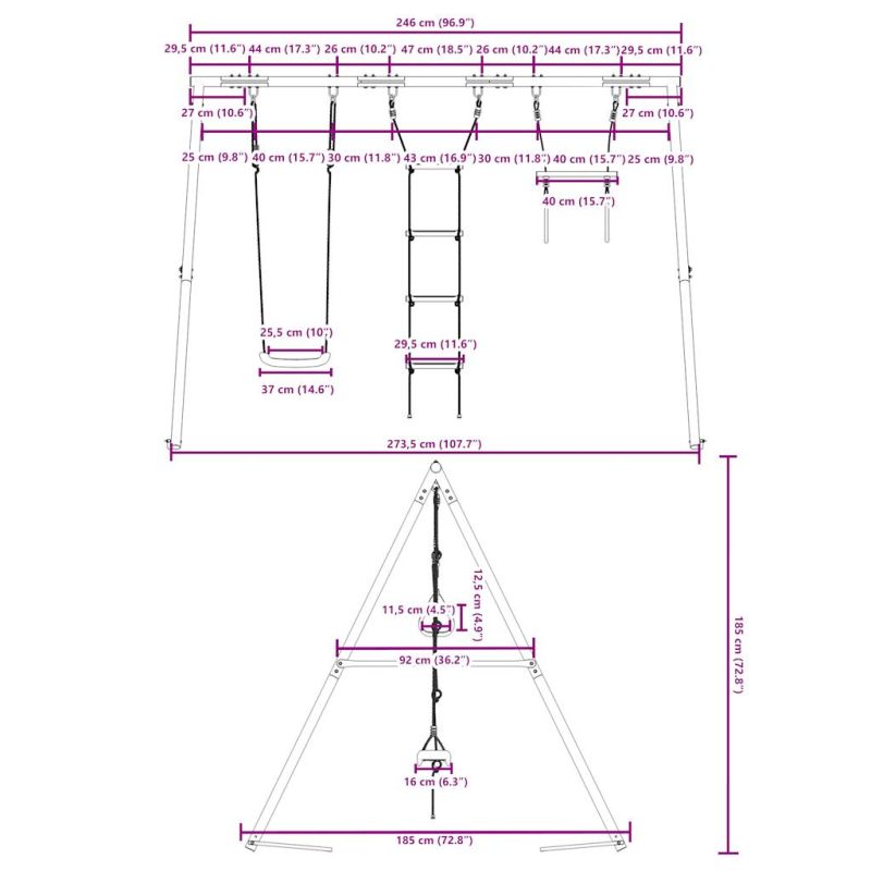 Превърнете градината си в детска площадка за вашите деца с тази външна люлка! Център за забавни занимания: Този комплект детски люлки разполага с 3 различни опции за игра със седалка люлка, стълба за катерене и трапец с халки за гимнастика. Така децата могат да се люлеят и катерят до насита.Издръжлива метална рамка: Тази рамка за люлка е изработена от боядисани стоманени тръби, които са устойчиви на ръжда, изключително здрави и устойчиви на деформация, осигурявайки отлична стабилност и издръжливост. А-образната структура предлага здрава опора без никакво колебание.Регулируема седалка за люлка: Тази градинска люлка е проектирана да расте с вашето дете, което я прави подходяща както за малки, така и за подрастващи деца. Чрез регулиране на дължината на въжето можете лесно да се приспособите към променящите се нужди на вашето дете.Многофункционални играчки за открито за деца: Тази градинска люлка помага на децата да подобрят своя баланс, координация, ловкост, сила и издръжливост, като същевременно предоставя различни начини за игра и упражнения.Широки приложения: Тази рамка за люлка може да се постави на различни места като градини, задни дворове, детски градини, детски площадки и др. Добре е да се знае:С оглед на безопасността всяка люлка трябва да се използва само от едно дете. Предупреждение. Не е подходящ за деца под 3 години. Само за домашна употреба. GPSR
