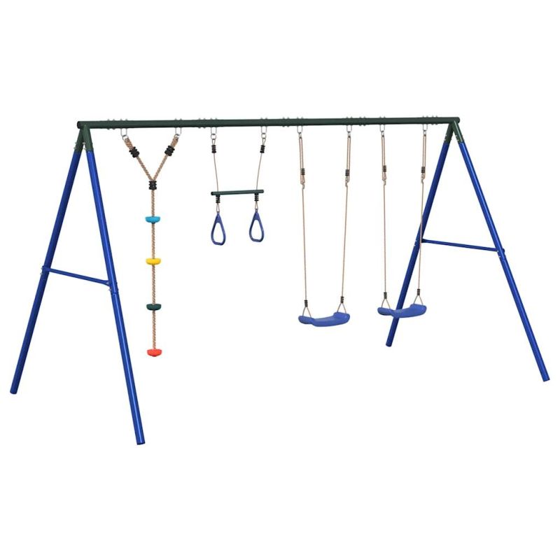 Превърнете градината си в детска площадка за вашите деца с тази външна люлка! Център за забавни занимания: Този комплект детски люлки разполага с 3 различни опции за игра с две седалки люлки, люлка въже с дискове и трапец с халки за гимнастика. Така децата могат да се люлеят и катерят до насита.Издръжлива метална рамка: Тази рамка за люлка е изработена от боядисани стоманени тръби, които са устойчиви на ръжда, изключително здрави и устойчиви на деформация, осигурявайки отлична стабилност и издръжливост. А-образната структура предлага здрава опора без никакво колебание.Регулируема седалка за люлка: Тази градинска люлка е проектирана да расте с вашето дете, което я прави подходяща както за малки, така и за подрастващи деца. Чрез регулиране на дължината на въжето можете лесно да се приспособите към променящите се нужди на вашето дете.Многофункционални играчки за открито за деца: Тази градинска люлка помага на децата да подобрят своя баланс, координация, ловкост, сила и издръжливост, като същевременно предоставя различни начини за игра и упражнения.Широки приложения: Тази рамка за люлка може да се постави на различни места като градини, задни дворове, детски градини, детски площадки и др. Добре е да се знае:С оглед на безопасността всяка люлка трябва да се използва само от едно дете. Предупреждение. Не е подходящ за деца под 3 години. Само за домашна употреба. GPSR