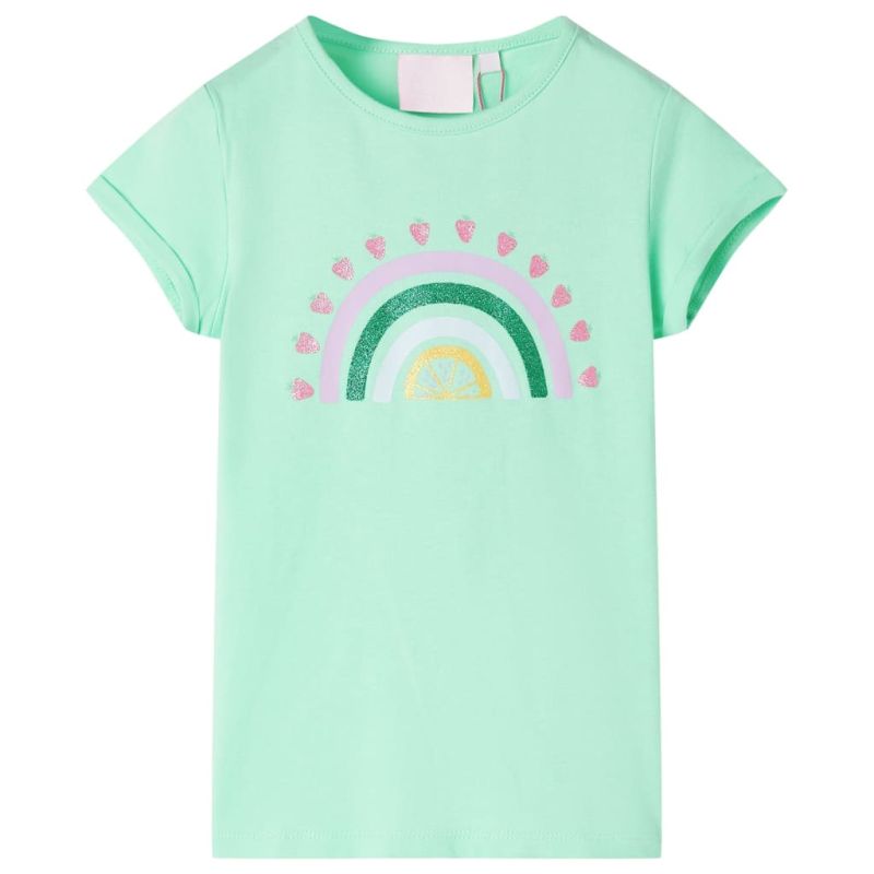 Нашата линия за детски дрехи е за достъпни, висококачествени и издръжливи ежедневни облекла за деца на възраст от 1,5 до 10 години. Нашата гама включва якета, пуловери, ризи и много други, с разнообразие от стилове, размери и цветове. Следвайки стандарта за високо качество на пазара, ние използваме висококачествени материали и усъвършенствани производствени техники. Тази детска тениска е с къси ръкави с пришити подгъви, обло деколте и прав модел. Тази тениска е щампована с искрящ мотив на дъга с ягоди, осеяни по външния край на дъгата. Детската тениска с къс ръкав е изработена от 95% памук и 5% еластан за комфорт и дишане. Добре е да знаете: Таблицата с размери на снимката предоставя размери за деца на възраст от 1,5 до 10 години, покриващи височина, гърди, талия и ханш. Лесно можете да намерите подходящата за вашето дете.