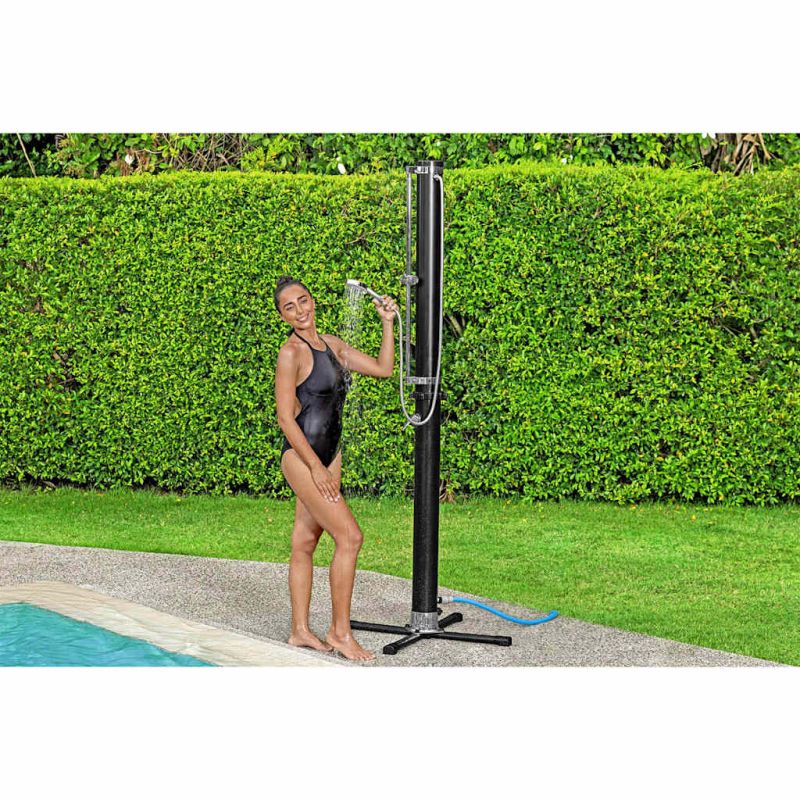 Външният душ Solar Flow от Bestway е идеалното решение за всички, които искат да се изкъпят преди да скочат в басейна, но не само. Издръжлив материал: Душът е изработен от издръжлива неръждаема стомана и PVC, които гарантират дълга издръжливост на продукта и устойчивост на атмосферни условия.Страхотно изживяване под душа: Свържете го към стандартен градински маркуч (маркучът не е включен) с един от бързите конектори и използвайте лесната, регулируема дръжка за воден поток и температура, за да създадете идеалното душ изживяване. Регулируемата душ глава може да бъде фиксирана или подвижна и има множество настройки за пръскане.Топъл душ: Оставете водата в резервоара с вместимост 20 л на градинския душ да се затопли от слънцето, за да се отпуснете.Лесен за сглобяване: Прикрепете соларния душ към включената голяма основа за допълнителна опора и преместете външния душ, където желаете по всяко време или го монтирайте директно на тераса или вътрешен двор, като го завинтите в земята.