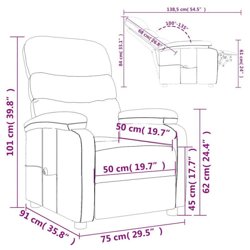 Облегнете се и се отпуснете в този изключително комфортен масажен стол! Функция за ръчно накланяне: Накланящият се стол е специално проектиран с 3 позиции на наклон, така че да можете да регулирате ръчно облегалката и поставката за крака според вашето удобство.Функция за вибрация: Представените 6 масажни точки ви позволяват да изпитате по-целенасочен масаж. Освен това включеното ръчно управление ви позволява да избирате различни програми за масаж. Функцията за масаж се захранва от USB конектора, но сертифицираният 5V USB източник на захранване не е включен.Удобно седене: Дебело подплатената седалка, облегалката и широките подлакътници, покрити с текстил, осигуряват уютно и топло усещане, което ви кара да се чувствате като в прегръдка, докато седите. Тъканта се отличава със семпъл и изчистен вид и е дишаща и издръжлива.Здрава и стабилна рамка: Рамката, изработена от дърво и метал, осигурява здрава структура и стабилност. Този накланящ се фотьойл е удобен и издръжлив. Този продукт се захранва с DC 5V, но сертифицираният 5V USB източник на захранване не е включен в комплекта. Моля, обърнете внимание, че трябва да използвате само сертифициран вход DC 5V. По-високото напрежение може да доведе до прегряване и да повреди устройството, както и до потенциален риск от прегряване и пожар.