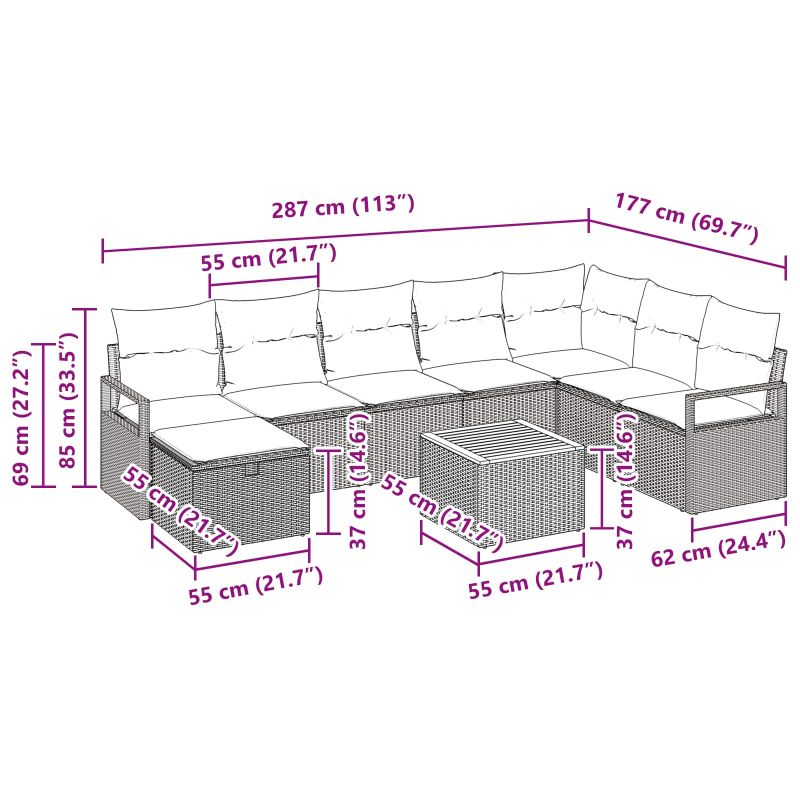 Градински Софа Комплект с възглавница 9 pcs Черно полиратан