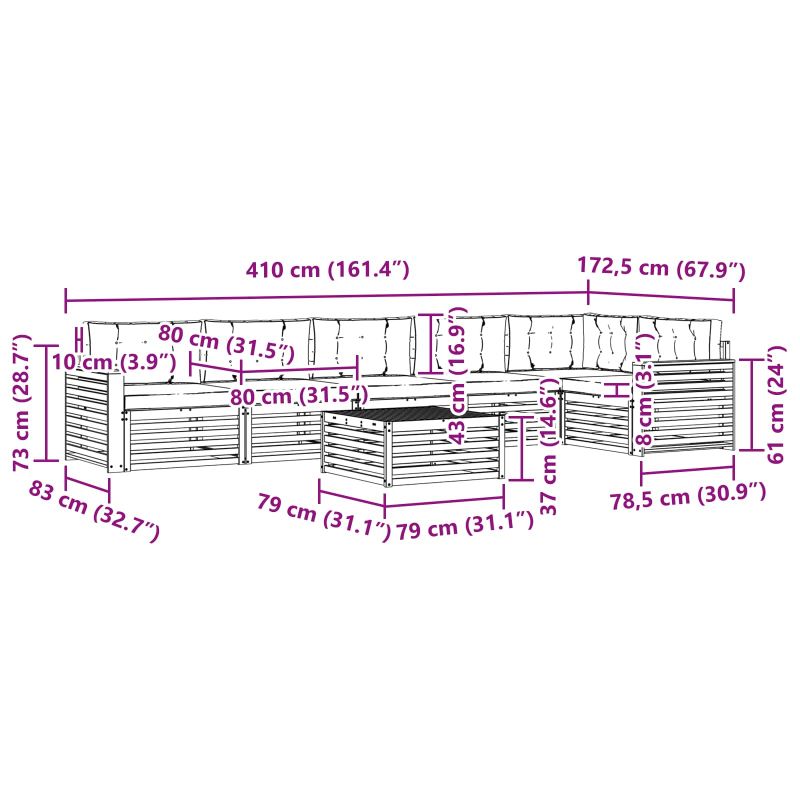 Комплектът за външна мебел съчетава стил и практичност, създавайки зашеметяващ акцент за всяка градина или тераса. Неговият модерен дизайн, в стил „минимализъм“, добавя елегантност, като същевременно осигурява комфорт за релаксиращи мигове или социални събития. Направен изцяло от масивна акация, комплектът предлага отлична издръжливост и дълготрайна визия, което го прави идеален за тези, които търсят баланс между комфорт и елегантност в мебелите за открито. Издръжлива масивна акация: Направен от масивна акация, този комплект за външни мебели е устойчив на неподходящи условия. Стойката предоставя стабилност, а топлият природен тон обогатява всяка градина или тераса. Устойчив на атмосферни условия: С лакирана повърхност, която защитава от слънце и дъжд, комплектът запазва визията и функционалността, осигурявайки дълготрайна употреба в градината. Компоненти и дизайн: Всеки елемент, от възглавниците до гръбчетата, е проектиран с вкус и функционалност. Поддържащите функции предлагат комфорт, докато целият дизайн е визуално приятен и подходящ за всеки случай на открито. Комфорт и многофункционалност: Модулният дизайн позволява различни конфигурации, отговарящи на нуждите на пространството. Перфектен за релаксация, приятелски събирания или просто четене, комплектът се адаптира лесно към всяко открито пространство, повишавайки комфорта и полезността. Лесна поддръжка: За да поддържате мебелите в добро състояние, просто избърсвайте повърхността с влажна кърпа, избягвайте остри почистващи средства. Редовната грижа запазва вида на мебелите за по-дълго.