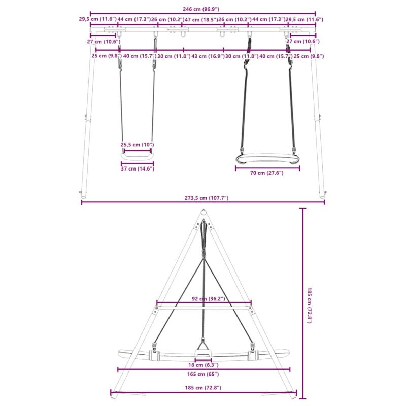 Превърнете градината си в детска площадка за вашите деца с тази външна люлка! Център за забавни дейности: Този комплект детски люлки разполага с 2 различни опции за игра със седалка люлка и овална люлка гнездо. Така децата могат да се люлеят и катерят до насита.Издръжлива метална рамка: Тази рамка за люлка е изработена от боядисани стоманени тръби, които са устойчиви на ръжда, изключително здрави и устойчиви на деформация, осигурявайки отлична стабилност и издръжливост. А-образната структура предлага здрава опора без никакво колебание.Регулируема седалка за люлка: Тази градинска люлка е проектирана да расте с вашето дете, което я прави подходяща както за малки, така и за подрастващи деца. Чрез регулиране на дължината на въжето можете лесно да се приспособите към променящите се нужди на вашето дете.Многофункционални играчки за открито за деца: Тази градинска люлка помага на децата да подобрят своя баланс, координация, ловкост, сила и издръжливост, като същевременно предоставя различни начини за игра и упражнения.Широки приложения: Тази рамка за люлка може да се постави на различни места като градини, задни дворове, детски градини, детски площадки и др. Добре е да се знае:С оглед на безопасността всяка люлка трябва да се използва само от едно дете. Предупреждение. Не е подходящ за деца под 3 години. Само за домашна употреба. GPSR