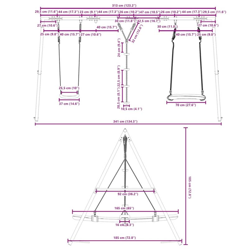 Превърнете градината си в детска площадка за вашите деца с тази външна люлка! Център за забавни дейности: Този комплект детски люлки включва 3 различни опции за игра с люлка седалка, люлка с дискове и овална люлка гнездо. Така децата могат да се люлеят и катерят до насита.Издръжлива метална рамка: Тази рамка за люлка е изработена от боядисани стоманени тръби, които са устойчиви на ръжда, изключително здрави и устойчиви на деформация, осигурявайки отлична стабилност и издръжливост. А-образната структура предлага здрава опора без никакво колебание.Регулируема седалка за люлка: Тази градинска люлка е проектирана да расте с вашето дете, което я прави подходяща както за малки, така и за подрастващи деца. Чрез регулиране на дължината на въжето можете лесно да се приспособите към променящите се нужди на вашето дете.Многофункционални играчки за открито за деца: Тази градинска люлка помага на децата да подобрят своя баланс, координация, ловкост, сила и издръжливост, като същевременно предоставя различни начини за игра и упражнения.Широки приложения: Тази рамка за люлка може да се постави на различни места като градини, задни дворове, детски градини, детски площадки и др. Добре е да се знае:С оглед на безопасността всяка люлка трябва да се използва само от едно дете. Предупреждение. Не е подходящ за деца под 3 години. Само за домашна употреба. GPSR