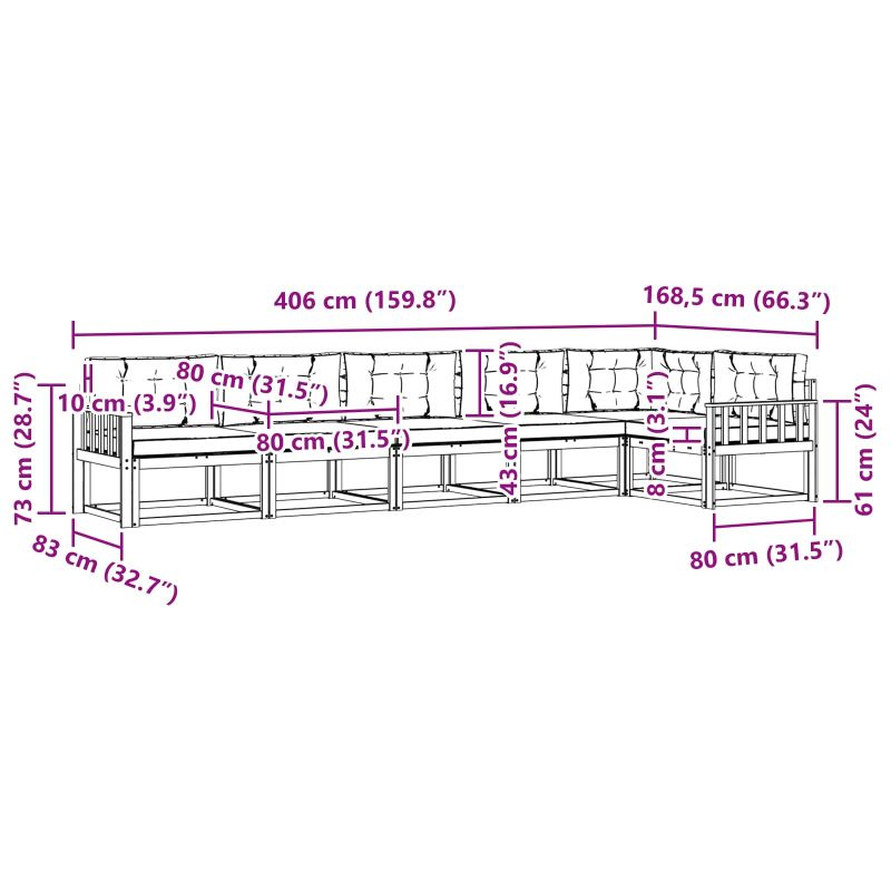 Този комплект градински секционен диван внася модерен стил навсякъде – било то градина, тераса, задния двор или дори край басейна. Съчетава стил и простота, а модулният му дизайн позволява да го настроите според нуждите си. Създаден е с внимание, за да бъде основна част на всеки открито пространство. Масивна акациева дървесина: Всеки елемент на комплекта е направен от здраво масивно акациево дърво. Красивите нюанси му придават елегантност, а здравината му осигурява дълготрайна издръжливост – идеалният избор за градина. Дизайн с ламели: Решетъчната облегалка и рамка добавят стил, докато подобряват въздушния поток. Този елемент е удобен и направен, за да привлича окото на любителите на красивото. Подкрепяща облегалка: Осигурява удобно сядане с ергономичен дизайн, правейки дългото седене приятно. Идеално за разговори или просто почивка. Модулни възможности: Модулният дизайн ви дава свобода да пренареждате местата. Създайте комфортна обстановка за всяко събиране или пък уютни кътчета за релакс. Поддръжка и грижа: Лесен за поддръжка, просто избършете с влажна кърпа. Когато не го ползвате, сложете покривало за по-дълготрайност.