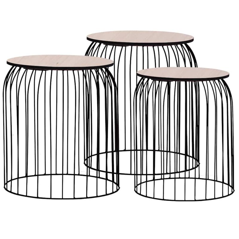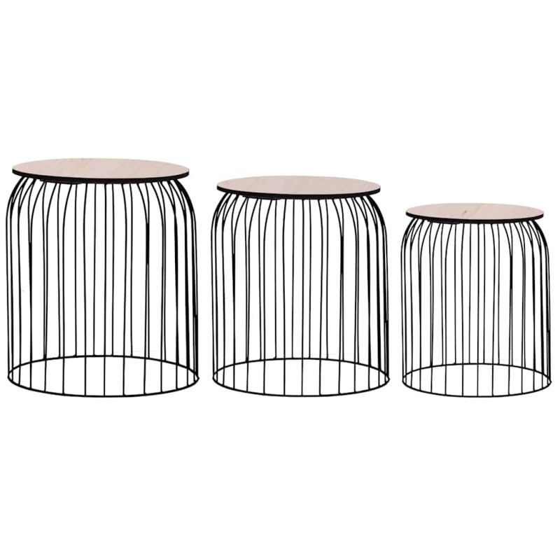 Този комплект от 3 кафе маси излъчва винтидж чар и ще бъде отличително допълнение към домашния ви декор. Те могат да се използват и като кошници за съхранение на вещи, холни маси, странични маси и др. Масивният плот на масата осигурява гладка и стабилна повърхност, върху която да поставяте напитки, вази или други декоративни предмети. Като отстраните плота, можете да превърнете страничната маса в кошница за съхранение. В допълнение, по-малката маса може да се постави в по-голямата, за да се пести място. Прахово боядисаната здрава метална рамка допринася както за стабилната конструкция, така и за индустриалния ѝ вид.