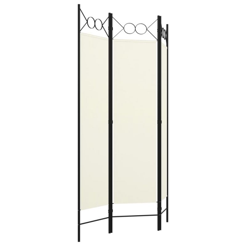 Нашият самостоящ и практичен разделител за стая, състоящ се от 3 панела, може да се използва за отделяне, добавяне на уединение или декорация. Той предоставя идеално лично пространство в спалнята или отделение в стаята. Горната част с дизайн на кръгове внася допълнителна елегантност. Изработен от прахово боядисана желязна рамка и текстилни платна, този разделител на стая може лесно да се сгъне, когато не се използва. Забележка: Платът не блокира светлината напълно.